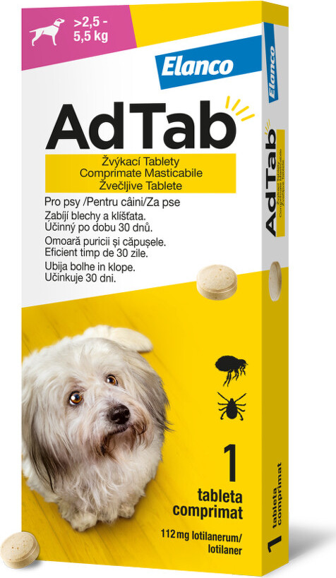 AdTab 112mg žvýkací tablety pro psy >2.5-5.5kg 1ks - balení 3 ks od Elanco - tento artikl nakupujte ve výprodejové akci za 619 Kč. Nabídku e-shopu pro vás připravuje tým odborníků. DOPRAVA ZDARMA nyní i bez speciálního kupónu, pro objednávky nad Kč. Jsme si jistí, že toto ocení nejeden zákazník.