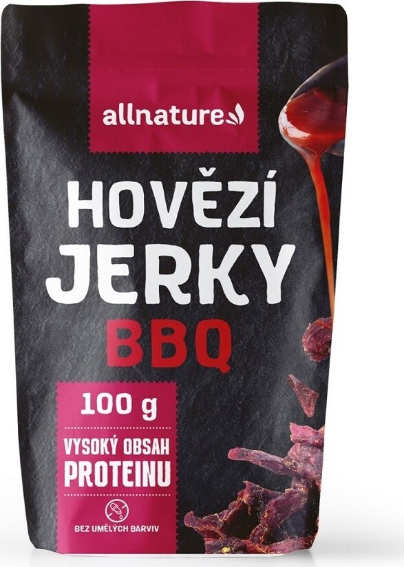 Allnature BEEF BBQ Jerky sušené hovězí maso. Hledáte ideální rychlou svačinu na cesty či výlety do přírody nebo jen potřebujete dodat energii při náročném dni v práci? Vyzkoušejte vysoce kvalitní sušené hovězí maso s příchutí barbecue, které je bohaté na protein. Díky téměř nulovému množství tuku a sacharidů a vysokému obsahu bílkovin vám zajistí regeneraci svalů a udrží v kondici po celý den.Balení obsahuje 100 g.