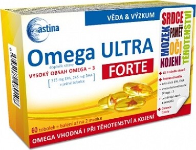 Výrobek Astina Omega ULTRA FORTE je doplněk stravy, který obsahuje prémiový, vysoce koncentrovaný a vysoce čistý rybí olej s obsahem 560 mg čistých omega-3 nenasycených mastných kyselin EPA a DHA, s minimem balastních tuků. Díky nadstandardnímu stanovení nejen těžkých kovů, ale i širokého spektra pesticidů v akreditované laboratoři poskytuje jistotu také těhotným, kojícím ženám a maminkám dětí, pro něž je užívání omega-3 velmi prospěšné. Omega Ultra forte obsahuje vysoké množství čistých omega-3 EPA a DHA, které přispívají k normální činnosti srdce. Příznivého účinku lze dosáhnout již při konzumaci 250 mg EPA a DHA denně. DHA přispívá k udržení normálního stavu zraku a mozku, příznivého efektu se dosahuje již při konzumaci 250 mg DHA denně. Balení obsahuje 60 tobolek.