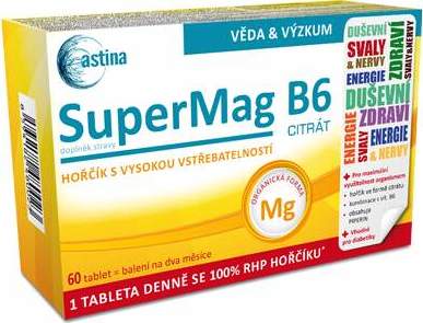 Doplněk stravy Astina Supermag je minerální přípravek s obsahem hořčíku a vitaminu B6. Hořčík se v tomto přípravku nachází v organické formě citrátu hořečnatého, která se lépe vstřebává v lidském organismu. Zvýšení vstřebatelnosti hořčíku lze dosáhnout v kombinaci s extraktem z černého pepře obsahující piperin.Hořčík přispívá k normální činnosti svalů.Hořčík přispívá k normální psychické činnosti.Hořčík přispívá k normální činnosti nervové soustavy.Hořčík přispívá ke snížení míry únavy a vyčerpání.Hořčík přispívá k udržení normálního stavu kostí.Hořčík přispívá k udržení normálního stavu zubů.Vitamín B6 přispívá k normální psychické činnosti.Vitamín B6 přispívá ke snížení míry únavy a vyčerpání.Balení obsahuje 30 tablet.