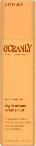 ATTITUDE Rozjasňující noční tuhý krém s vitaminem C je určený pro hydrataci a vyživení pleti. Příznivě působí také na snížení známek stárnutí pleti. Krém v podobě tyčinky na obličej ATTITUDE Oceanly Phyto-Glow má bohatou texturu, která se vstřebává do vnější vrstvy pokožky. Viditelně rozzáří mdlou pleť pomocí přírodních ingrediencí, zejména fytoglykogenu. Tato látka rostlinného původu je účinnou novinkou ve světě kosmetiky a umí dlouhodobě hydratovat pleť účinněji než kyselina hyaluronová.Výhody:Má dermatologicky testované neparfemované složení, které je jemné, pevné a rychle se vstřebává do pokožky.Dodává se v revolučním bezplastovém a recyklovatelném papírovém obalu s certifikací FSC.Je bez živočišných složek, netestováno na zvířatech.Mimo fytoglykogen pro hydrataci v krému najdete:stabilizovaný vitamin C s antioxidačními vlastnostmi, který sjednocuje pleťolej ze světlice barvířské s vysokým množstvím omega-6 mastných kyselin pro ochranu kožní bariéry zadržující vlhkost v pletivýtažek z medu pro vláčnostmatující extrakt z řas pro obnovení vláčnosti pletiRozjasňující tuhý noční krém Phyto-Glow z řady Oceanly od značky ATTITUDE je neparfémovaný a dodávaný v recyklovatelných papírových tubách bez plastů. Pro jejich výrobu byl využitý materiál z udržitelně obhospodařovaných lesů, a je tak šetrný nejen k pokožce, ale i životnímu prostředí.Balení obsahuje 30 g.