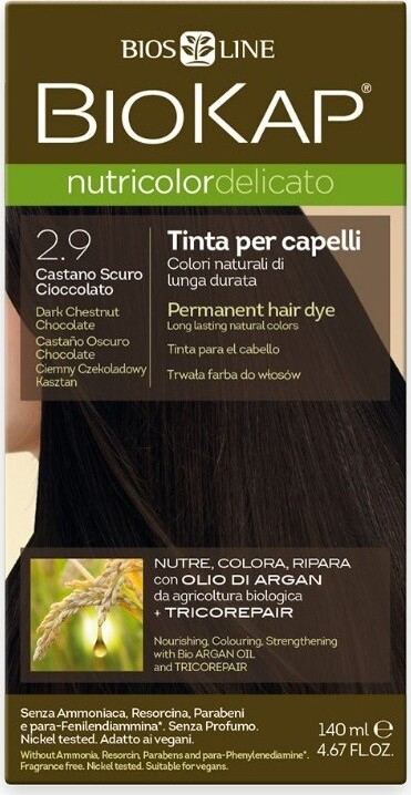 Barva na vlasy s 92% podílem přírodních složek, která vlasům dodá dlouhotrvající zářivou barvu a lesk. Dokonale kryje šediny a je obohacena přírodními extrakty pečující o vlasy i o pokožku hlavy. Dodá výživu a zajistí jejich hydratační rovnováhu.Obsahuje arganový olej v bio kvalitě, který vlasy hluboce vyživuje díky vysokému obsahu nenasycených mastných kyselin a vitamínu E. Exkluzivní a inovativní TRICOREPAIR komplex (rýžové proteiny, výtažek z vrby a lipofilní ovocné kyseliny) zajišťuje ochranu vlasů a regeneraci.Šetrná a extra rychlá přírodní barva na vlasy (funguje podstatně rychleji než ostatní srovnatelné produkty).Výsledkem je dokonalá jasná barva, lesk a zdravý vzhled vlasů a perfektní překrytí šedin.Vhodné pro vegany. Vhodné i pro velmi citlivou pokožku.Neobsahuje žádné potenciálně rizikové látky (amoniak, parabeny, resorcin, para-fenylendiamin PPD).Je testována na nikl.Značka BIOKAP představuje vlasovou kosmetiku vyrobenou v Itálii. Patří mezi top výrobce organických barev na vlasy v Itálii. Jedná se o kvalitní šetrné přípravky inspirované bohatstvím přírody a vyvinuté ve spolupráci s předními italskými univerzitami. Pěstování, sběr i následné zpracování podléhají certifikovanému kontrolnímu systému.Balení 140 ml obsahuje: 1x lahvičku na vlasy s rostlinnými výtažky, 1x lahvičku fixačního činidla, 1x sáček šamponového vlasového balzámu, 1 pár jednorázových ochranných rukavic, 1x návod k použití.