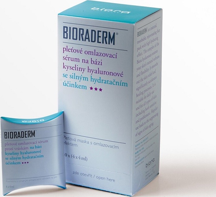 BIORADERM je pleťové vstřebatelné sérum proti všem typům vrásek s obsahem přírodní vysokomolekulární kyseliny hyaluronové.Tento kosmetický prostředek se po aplikaci okamžitě vstřebává, efekt je ihned viditelný. Komplex hyaluronanu navrací pleti její přirozenou jemnost a pružnost, vyhlazuje kožní reliéf a pleť hydratuje. BIORADERM neobsahuje konzervační látky, proto je vhodný i pro citlivé typy pletí.Jak působí na pleť?BIORADERM se vstřebává zcela, doba účinnosti není tedy limitována. Protože účinná látka je látkou tělu vlastní, je mimořádně dobře při vnější aplikaci snášena všemi typy pletí včetně citlivých.Balení obsahuje 4 jednorázové ampule každá o objemu 4 ml. Po otevření je nutné obsah spotřebovat, případně je možné zbytek uchovat dva až tři dny v chladničce.