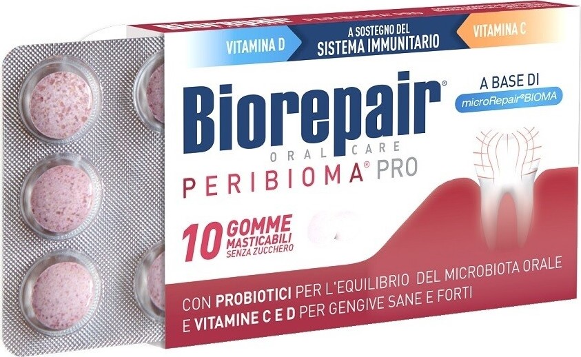 Orální mikrobiota znamená všechny mikroorganismy žijící v rovnováze v našich ústech. Variace této rovnováhy mohou způsobit zánět, krvácení dásní a časné příznaky paradentózy. Špatná výživa, slabá imunitní obrana či stres mohou způsobit nerovnováhu mikroflóry, ať už orální nebo střevní. Žvýkačky Biorepair periboma obsahují microRepair®Bioma, mikrokrystal z hydroxyapatitu přidaný se třemi miliardami vybraných probiotik, které pomáhají obnovit rovnováhu ústní mikroflóru.Balení obsahuje 10 žvýkaček.