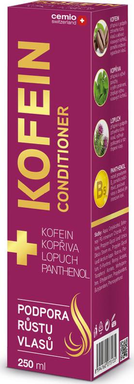Cemio kondicionér s kofeinem, kopřivou a lopuchem pro podporu kvality a hebkosti vlasů, výborně doplňuje účinky Cemio Kofein šamponu.Kondicionér pro péči a růst vlasů.Vlasům dodá výživu, hydrataci a pevnost.Jedinečná kombinace kofeinu, kopřivy, lopuchu a panthenolu.Kofein přispívá k podpoře zdravého růstu vlasů a aktivaci vlasových kořínků, pomáhá snižovat vypadávání vlasů.Kopřiva přispívá k výživě pokožky hlavy a jejímu prokrvení, zlepšuje výživu vlasových kořínků.Lopuch přispívá k podpoře zdravého růstu vlasů, vyživuje poškozené a roztřepené vlasy.Panthenol neboli provitamin B5 pomáhá zvláčňovat, posilovat vlasy a dodává jim intenzivní lesk.Výhody:pečuje a vyživuje barvené vlasydodává vlasům hydrataci, výživu a pevnostposiluje vlasy od kořínků, zklidňuje pokožku hlavyjednoduché rozčesání vlasůpéče a podpora zdravého růstu vlasůPro koho je vhodný:Pro každého, kdo pečuje o své vlasy a chce podpořit zdravý růst vlasů.*Pro každého, kdo se stará o své vlasy a chce jim dodat sílu, lesk a hydrataci.Pro každého, koho trápí svědění pokožky hlavy.*dědičnéBalení obsahuje 250 ml.