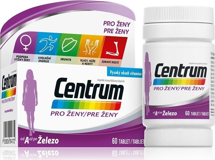 Doplněk stravy Multivitamin Centrum Pro ženy je kompletní multivitamin s vitaminy, minerály a stopovými prvky, který byl vytvořen speciálně pro potřeby moderních žen.Vyvážená strava je důležitá pro každou ženu, aby se cítila a vypadala co možná nejlépe. Proto je multivitamín Centrum pro ženy speciálně vyvážený tak, aby vyhověl jedinečným nutričním potřebám dnešních žen a přinášel jim nezbytné vitaminy, minerály a stopové prvky.Pro naplnění výživových potřeb žen je důležitá kombinace odborných znalostí a péče. Oba tyto faktory tvoří základní filozofii tohoto přípravku.Centrum pro ženy obsahuje vitamín A, B12, B1, B6, C, K, E, D3, zinek, železo, B2, mangan, měď, hořčík, jód, selen, molybden, chrom, fosfor, vápník, niacin a biotin.Vitamín A přispívá k udržení normálního stavu zraku.Vitamín B12 přispívá k normální činnosti imunitního systému.Vitamín B1 přispívá k normální činnosti nervové soustavy.Vitamín B6 přispívá k normální činnosti imunitního systému.Vitamín C přispívá k normální funkci imunitního systému.Vitamín K přispívá k udržení normálního stavu kostí.Vitamín E přispívá k ochraně buněk před oxidativním stresem.Vitamín D3 přispívá k udržení normálního stavu kostí.Zinek přispívá k ochraně buněk před oxidativním stresem.Železo přispívá k normální tvorbě červených krvinek a hemoglobinu.Vitamín B2 přispívá k normální činnosti nervové soustavy.Mangan přispívá k normálnímu stavu kostí.Měď přispívá k normální činnosti nervové soustavy.Hořčík přispívá k normální činnosti svalů a nervové soustavy.Jód přispívá k normálnímu energetickému metabolismu.Selen přispívá k normální funkci imunitního systému.Molybden přispívá k normálnímu metabolismu sirných aminokyselin.Chróm přispívá k udržení normální hladiny glukózy v krvi.Fosfor přispívá k udržení normálního stavu kostí.Vápník přispívá k udržení normálního stavu kostí.Niacin přispívá k udržení normálního stavu pokožky.Biotin přispívá k udržení normálního stavu pokožky.Balení obsahuje 60 tablet.Pořiďte také Centrum pro muže.