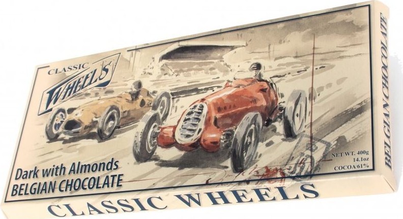 Belgická čokoláda Classic Wheels je velmi populární hořká tabulková čokoláda s mandlemi v retro obalu pro všechny fanoušky historických aut.Hmotnost: 400 g.