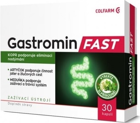 Colfarm Gastromin Fast je doplněk stravy s výtažky z kopru, artyčoku a meduňky.Kopr podporuje normální trávení a přispívá k normální funkci střevního traktu.Artyčok přispívá k normálnímu trávení, normální funkci střev a jater a k pročištění.Meduňka podporuje zažívací a trávící systém.Balení obsahuje 30 kapslí. Hmotnost obsahu: 6 g.