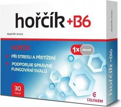 Colfarm Hořčík + B6 je doplněk stravy ve formě kapslí.Hořčík přispívá ke správnému fungování svalů, včetně srdečního svalu. Pozitivně působí na udržování rovnováhy elektrolytů a podporuje správné získávání energie v metabolických procesech. Hořčík pomáhá udržovat zdravé zuby a kosti. Přispívá také k správnému průběhu duševních činností.Hořčík a vitamin B6 pomáhají snižovat pocit únavy.Balení obsahuje 30 kapslí. Hmotnost obsahu: 20 g.