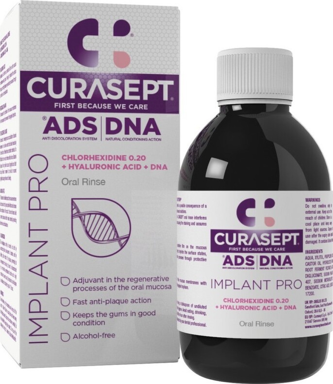 CURASEPT ADS DNA IMPLANT PRO Ústní voda 200ml od oblíbené značky Curasept - toto zboží si můžete zakoupit za perfektní cenu 249 Kč. Nákup přes nás znamená jistotu dobré ceny. Při objednávce nad Kč získáte DOPRAVU ZDARMA. Lepší nabídku už na trhu hledat nemusíte.