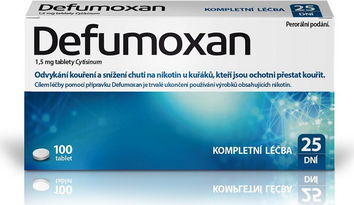 Defumoxan je volně prodejný léčivý přípravek k odvykání kouření a snížení chuti na nikotin u kuřáků a závislých na nikotinu. Defumoxan neobsahuje nikotin a doba trvání léčby je 25 dní. Jedno balení přípravku Defumoxan (100 tablet) postačuje ke kompletní léčebné kúře. Cílem léčby Defumoxanem je trvalé ukončení používání výrobků obsahujících nikotin. Léčivou látkou je rostlinný alkaloid cytisin, který má podobnou chemickou strukturu jako nikotin. Jeho působení je podobné nikotinu, ale obecně slabší. Umožňuje pozvolné snížení závislosti na nikotinu tím, že zmírňuje abstinenční příznaky. Klinické studie a předchozí zkušenosti s užíváním přípravku Defumoxan obsahujícího cytisin naznačují dobrou snášenlivost této látky.Balení obsahuje 100 tablet.