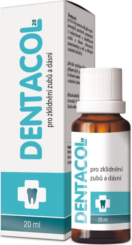 Dentacol je určen ke zklidnění zubů, dásní, defektů v dutině ústní a citlivých zubních krčků. Pozitivně působí na stav mikroflóry v ústech. Obsahuje hřebíček s účinnou látkou eugenol, který má silné zklidňující účinky, a skořici pozitivně působící na mikroflóru v dutině ústní.pro úlevu od nepříjemných stavů v dutině ústníke zklidnění zubů, dásní, defektů v ústní dutině a citlivých zubních krčkůpro zachování normální mikroflóry ústVelikost balení je 20 ml.