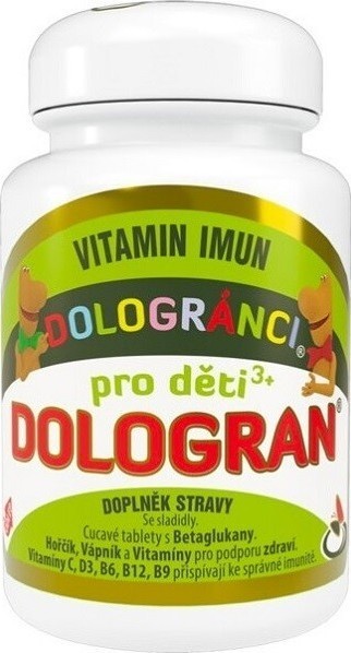 Dologran pro děti Dologránci Vitamin Imun je doplněk stravy ve formě cucavých tablet s pomerančovou příchutí. Přípravek obsahuje betaglukany z hlívy ústřičné, hořčík a vápník. Dále obohaceno o vitamin C, D3, B6, B12 a B9. Hořčík přispívá ke snížení míry únavy a vyčerpání. Vápník je potřebný pro udržení normálního stavu kostí. Vitamin C přispívá k normální funkci imunitního systému. Vitamin D přispívá k normální funkci imunitního systému. Vitamin B6 přispívá k normální psychické činnosti. Vitamin B12 přispívá ke snížení míry únavy a vyčerpání. Balení obsahuje 60 tablet.