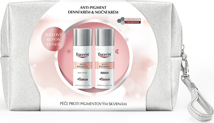 V dárkovém setu EUCERIN ANTIPIGMENT najdete denní krém pro redukci pigmentových skvrn s ochranou SPF 30 a noční krém vytvořený speciálně pro noční péči o pleť postiženou pigmentovými skvrnami.Eucerin® ANTI-PIGMENT Denní krém SPF 30 Obsahuje thiamidol, účinnou a patentovanou složku, která cíleně řeší příčinu vzniku hyperpigmentace snížením tvorby melaninu. Klinické a dermatologické testy prokázaly, že redukuje pigmentové skvrny a brání jejich opakovanému výskytu. První výsledky jsou viditelné po dvou týdnech a při pravidelném používání se stav pleti dále zlepšuje. Díky UVA a UVB filtrům poskytuje tento hydratační denní krém účinnou ochranu před slunečním zářením a snižuje pravděpodobnost výskytu pigmentových skvrn vlivem slunečního záření na pleť. Pleť získává sjednocený tón a zářivý vzhled. Krém se rychle vstřebává. Jemná parfemace.Eucerin® ANTI-PIGMENT Noční krémObsahuje thiamidol, účinnou a patentovanou složku, která cíleně řeší příčinu vzniku hyperpigmentace snížením tvorby melaninu. Klinické a dermatologické testy prokázaly, že redukuje pigmentové skvrny a brání jejich opakovanému výskytu. První výsledky jsou viditelné po dvou týdnech a při pravidelném používání se stav pleti dále zlepšuje. Noční krém obsahuje také dexpanthenol - aktivní složku známou svojí schopností podporovat regeneraci pleti během spánku. Pleť získává sjednocený tón a zářivý vzhled. Jemná parfemace.