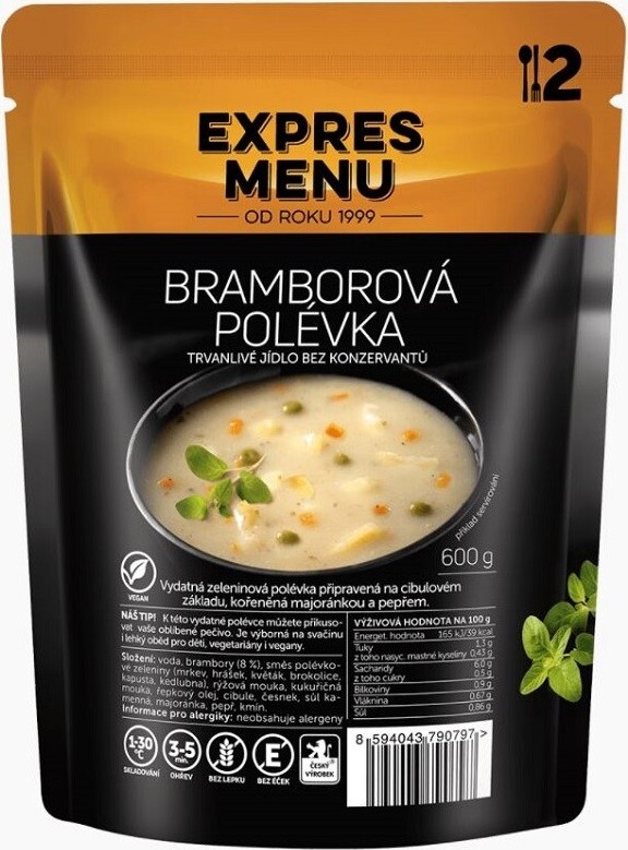 Expres Menu Bramborová polévka 600 g od proslulé značky EXPRES MENU - tento artikl musíte mít za jedinečnou cenu 69 Kč. Čekáme, že tahle nabídka se zařadí mezi bestsellery. Jen nyní je POŠTOVNÉ ZDARMA, když si vyberete zboží nad Kč. Lepší nabídku už na trhu hledat nemusíte.