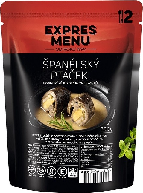 Složitá příprava španělských ptáčků vám nyní zabere díky Expres Menu jenom několik minut, aniž byste byli ochuzeni o chuťový zážitek tohoto lahodného pokrmu. Zadní hovězí plátek je potřený hořčicí, pokladený uvařeným vejcem, okurkou a špekem, zatočený a dušený doměkka. Omáčka je připravena na cibulovém základu.Neobsahuje lepek ani konzervanty.Balení obsahuje 2 porce a má hmotnost 600 g.