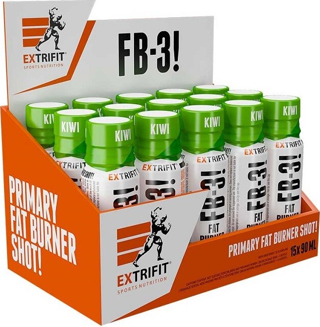Extrifit FB-3! Fat Burner Shot je doplněk stravy s příchutí kiwi. Spalovač tuku určený pro všechny, kdo hledají suplement, který zároveň podpoří i jejich tréninkový výkon. Obsahuje tři základní složky pro spalování. Synefrin 20 mg v maximální legální dávce, 2000 mg karnitinu a vysoká dávka kofeinu 200 mg.Přesné načasování užití produktu je zásadní pro jejich efekt. To se týká i spalovačů tuku a předtréninkových produktů. Můžete tak mít s sebou jednorázové praktické balení, a to ještě v tekuté formě s rychlou a výbornou stravitelností a vstřebatelností. Aktivní látky:synefrin (extrakt z Citrus aurantium) – podporuje metabolismus lipidů, přispívá ke kontrole tělesné hmotnosti, podporuje normální funkce dýchacího systému, normální trávení a chuť k jídlukofein – pomáhá zlepšit soustředění, zvýšit bystrost, čilost a hbitost, pomáhá zvýšení vytrvalostního výkonuL-karnitin – nejpoužívanější látka ve všech spalovačíchJe vhodný nejen pro ty, kdo se věnují kulturistice a fitness, ale i pro jiné typy pohybových aktivit (např. vytrvalostní pohybové aktivity).Balení obsahuje 15 x 90 ml.