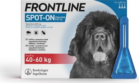 FRONTLINE Spot-On umožňuje bojovat proti parazitům psů. Je účinný proti: Blechám - FRONTLINE Spot-On zabíjí dospělé blechy během 24 hodin po napadení vašeho zvířete. Klíšťatům - FRONTLINE Spot-On eliminuje více než 90% klíšťat během 48 hodin po přichycení na zvířeti a tím snižuje riziko přenosu onemocnění. Toto riziko je největší 48 hodin po přichycení klíštěte na zvířeti. Všenkám - FRONTLINE Spot-On usmrtí všenky na zvířeti nejpozději do 48 hodin Balení obsahuje 3x 4,02 ml - pipety jsou vhodné pro psy o hmotnosti 40 - 60 kg.