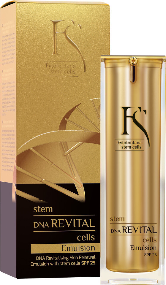 Fytofontana Stem Cells DNA Revital Emulsion je emulze s kmenovými buňkami na obnovu pokožky a revitalizaci DNA - SPF 25.Tato emulze je revolučním spojením účinných látek kmenových buněk na obnovení pokožky, doplněné o účinné látky na bázi peptidů s intenzivním DNA regeneračním účinkem a účinkem proti vráskám. Přípravek poskytuje optimální ochranu proti příznakům stárnutí pokožky. Použití přípravku se doporučuje na ošetření unavené a vnějšími vlivy poškozené pokožky.DNA Revital chrání DNA před poškozením na genetické úrovni. Stupňuje regeneraci DNA a tím značně oddaluje počátek procesu stárnutí pokožky.Používáním přípravku se mimické vrásky vyhlazují, odolnost pleti se zvyšuje a pokožka se stává pevnou, zářivou a omlazenou. Zkoušky provedené na fibroblastových buňkách potvrdily, že buněčná struktura pokožky se díky DNA Revitalu omladí o 10 let.Přípravek je vhodný pro ženy i muže.
