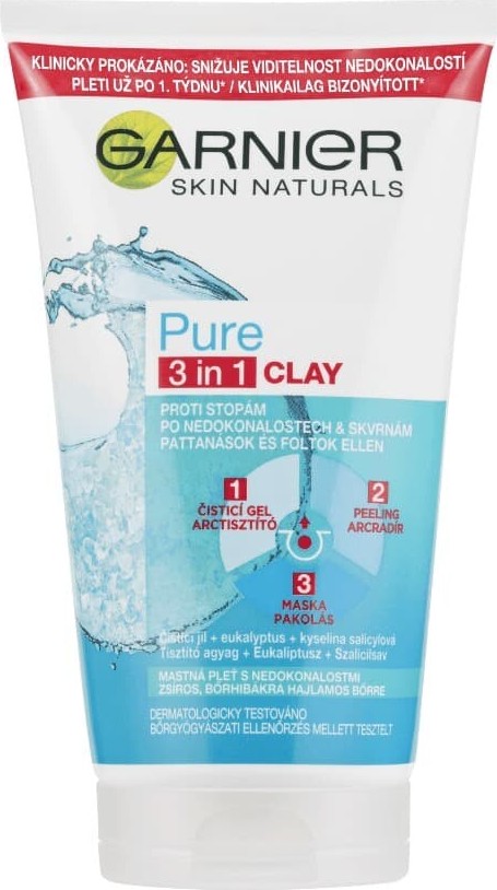 Garnier Skin Naturals Pure 3v1 gel, peeling a maska je určen k ošetření smíšené až mastné pleti se sklonem k nedokonalostem, lesku a rozšířeným pórům. Složení s kyselinou salicylovou a minerály působí proti tvorbě akné a nečistotám. Obsažený zinek projasňuje pokožku a reguluje tvorbu kožního mazu. Pleť je tak optimálně vyčištěna. Peeling s pemzou odstraňuje odumřelé kožní buňky a uvolňuje póry. Jako maska s kaolinem uklidňuje pokožku, čistí ji a zmatňuje. Velikost balení je 150 ml.