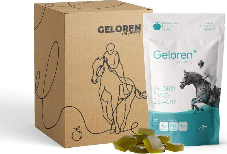 Kloubní výživa s koňskou dávkou kyseliny hyaluronové pro zdravé klouby, vazy a šlachy. Geloren HA je vhodným doplňkem výživy koní při většině typů kloubních problémů, ale může také přispívat k prodloužení aktivního života nejen u sportovních koní.Vhodné:při pohybových problémechpři nadměrné zátěžipro zvýšení možnosti bezbolestného pohybu i ve stáříAktivní látkyKyselina hyaluronová: Nejdůležitější složka kloubní tekutiny. Promazává klouby, tlumí nárazy a napomáhá zlepšovat stav při bolestech a zánětech kloubů.Chondroitin sulfát: Důležitá součást kloubní chrupavky a synoviální tekutiny. Zaručuje pružnost, pevnost a odolnost chrupavky.Želatina:  Látka bílkovinné povahy v dobře stravitelné formě poskytující základní stavební součásti pro tvorbu kolagenu. Kolagen je důležitý pro zdravé šlachy, vazy a chrupavky.Balení obsahuje 180 žvýkacích želé s příchutí jablka. Čistá hmotnost: 1350 g.
