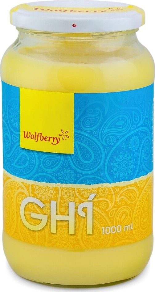 Ghí přepuštěné máslo Wolfberry. Ghí je máselný tuk vyrobený podle tradičního receptu přepuštěním 100% másla. Máselný tuk, kterému se dnes říká podle indické kuchyně ghí, není žádnou novinkou ani v českých luzích a hájích. Naše babičky, nebo slavná kuchařka Magdalena Dobromila Rettigová, mu říkaly přepuštěné máslo nebo šmolc. Oceňovaly především to, že díky absenci vody a bílkovin nežlukne, takže v dobře uzavřené nádobě vydrží na chladném a temném místě i několik měsíců. Ghí je čistý tuk, který se připravuje velice pomalým přepouštěním másla. Při této proceduře se z másla odpařuje voda, ale i vznikající pěna, ve které jsou mléčné bílkoviny, cukry a další látky, které obsahuje běžné máslo. Výsledným produktem je opravdu čistý tuk, který má žlutou barvu a lahodnou máslovou vůni i chuť s mírně nasládlým, ořechovým podtónem. Ghí se sice vyrábí z másla, ale díky zpracování se v něm nenachází laktóza ani kasein. Díky této vlastnosti si ho mohou, po poradě s lékařem, dopřát i lidé, kteří mají rádi chuť másla, ale trpí alergií na některou z mléčných složek. Další z jeho neocenitelných vlastností je velmi vysoký bod zápalnosti, který se pohybuje okolo 240°C. Této schopnosti je dosaženo právě díky tomu, že při přepouštění másla jsou odstraněny všechny jeho příměsi. Při pečení nebo smažení tak nedochází k přepalování látek obsažených v tucích s nižším bodem kouřivosti a k jejich škodlivému uvolňování do potravin.Výhody:Ghí je přefiltrovaný máselný tuk, získávaný přepuštěním másla. To je zbavený bílkovin a vody.Je vhodný pro všechny způsoby přípravy pokrmů.Nepřepaluje se, proto je ideální na smažení. Má také mnohem delší trvanlivost než klasické máslo.Balení obsahuje 1000 ml.