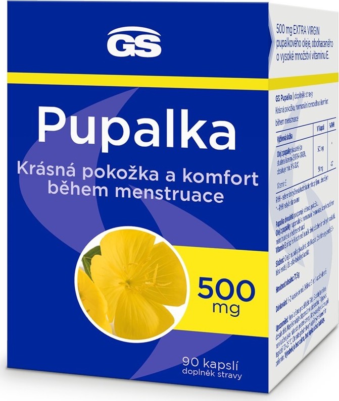 GS Pupalka je doplněk stravy ve formě kapslí, obsahující extra virgin olej pupalky dvouleté a vitamin E. Pupalkový olej je bohatým zdrojem esenciálních mastných kyselin (linolenová, linolová a olejová (GLA)).Pupalka dvouletá:přispívá k (před) menstruačnímu komfortupodporuje normální činnost kardiovaskulárního systému, podporuje přirozenou obranyschopnost - imunitní systém a normální stav pokožkyVitamin E přispívá k ochraně buněk před oxidativním stresem.Extra virgin olej lisovaný za studena.Navíc obohacený o vitamin E, který napomáhá k ochraně buněk před oxidativním stresem.Měkké kapsle.Pro koho je určen: Je vhodný pro ženy a pro děti od 3 let.Balení obsahuje 90 kapslí.