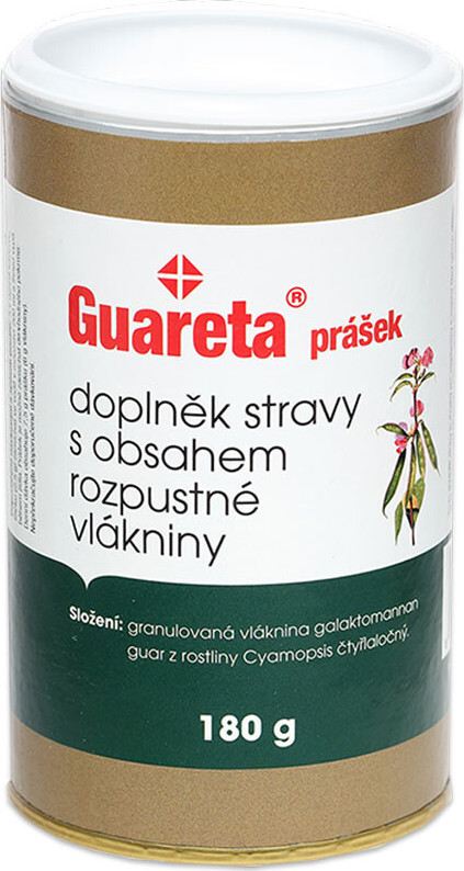 Guareta prášek s obsahem rozpustné vlákniny je doplněk stravy, který obsahuje čistou vlákninu, která se nazývá galaktomanan guar. Prášek má neutrální chuť a je určen k zamíchání do vhodného pokrmu. Používá se také ke změně textury pudinků Guareta, kdy se stávají hutnějšími a jsou tak vhodné k pozvolnému ujídaní. Velikost balení je 180 g.