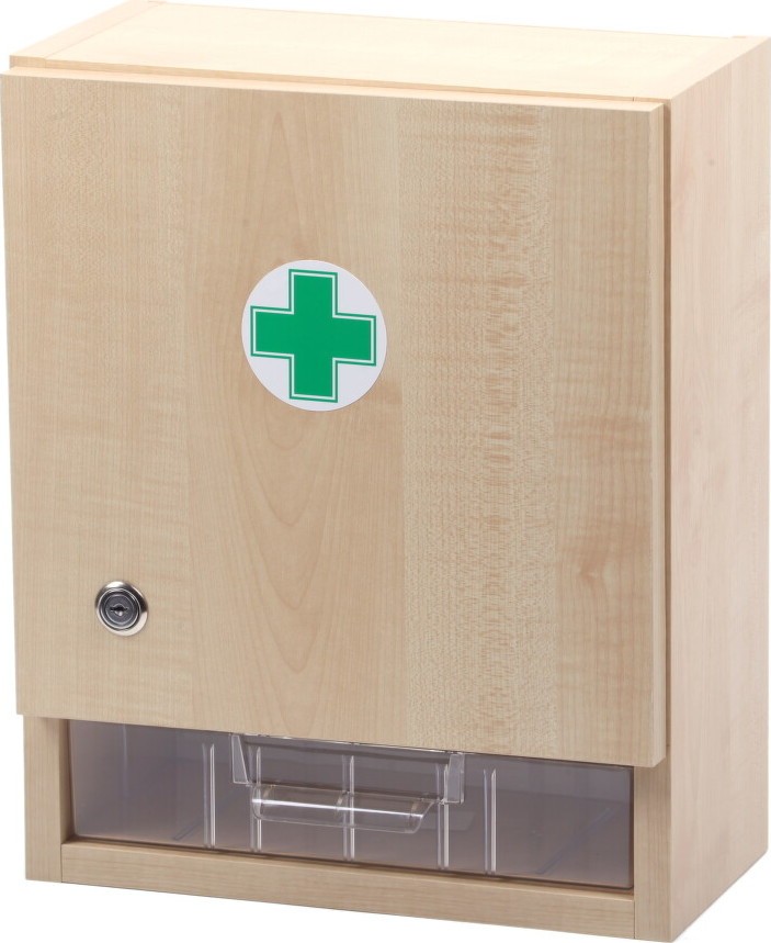 Prázdná nástěnná lékárna je vhodná pro výrobní provozy, živnosti, obchody, kanceláře či domácnosti. Skříňka je vyrobena z dřevěného lamina. Rozměry lékárny jsou 400x310x170 mm.