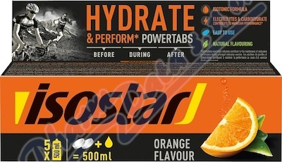 Isostar Powertabs je sacharidový nápoj pro sportovce obohacený doplňky stravy (vitamíny a elektrolyty) s příchutí pomeranče. Výrobek se sníženou energetickou hodnotou (obsah sacharidů snížen o 30% proti energetickým nápojům standardně dodávaným na trh). Obsahuje: Vitamín C přispívá k udržení normální funkce imunitního systému během intenzivního fyzického výkonu a po něm. Vitamín E přispívá k ochraně buněk před oxidativním stresem. Vápník přispívá k normální činnosti svalů. Hořčík přispívá ke snížení míry únavy a vyčerpání. - Napomáhá v procesu regenerace