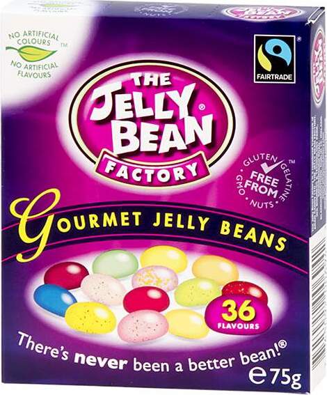 Jelly Bean fazolky Gourmet Mix box přinášejí 36 báječných příchutí žvýkacích bonbonů s obsahem pravých ovocných šťáv pro dokonalý gurmánský zážitek. Bonbóny jsou bez umělých příchutí a barviv, bez geneticky modifikovaných složek. Neobsahují ořechy ani lepek.Příchutě: jahoda, mandarinka, granátové jablko, hroznové víno, jablko, havajský ananas, citrón s limetou, banánový split, borůvkový koláč, kyselý citrón, café latté, karibský kokos, tropický punč, žvýkačka, ostružina, hruška, růžový grep, francouzská vanilka, karamelový popcorn, broskvový koláč, candy floss, marshmallow, mátový sorbet, skořice, karamel, Piňa Colada, passionfruit, cola, divoká třešeň, vodní meloun, jahodové smoothie, kiwi, mango, malinový džem, lékořice, brusinka s jablkem.Balení obsahuje 75 g.