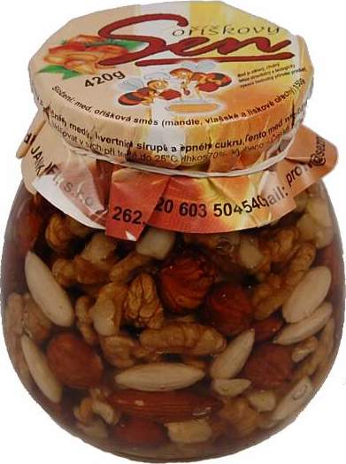 Med Oříškový sen obsahuje 3 druhy ořechů, kterými jsou lísková jádra, vlašské ořechy a mandle a med. Tento med se zajímavým složením se doporučuje při hypoglykémii, při těžké fyzické práci nebo sportu a při nervovém zatížení a potřebě relaxovat.