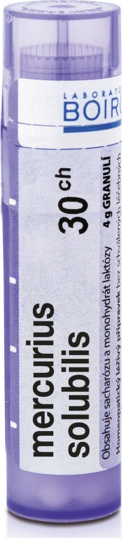 MERCURIUS SOLUBILIS 30 CH je homeopatický přípravek.Obsahuje sacharózu a monohydrát laktózy.Balení obsahuje 4 g granulí.Pozorně čtěte příbalovou informaci.