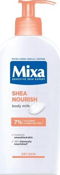 Mixa intenzivní vyživující tělové mléko je koncentrovaná tělová péče s obsahem glycerinu a alantoinu pro výživu a hydrataci. Tělové mléko je určeno na suchou a citlivou pokožku. Intenzivně vyživuje a poskytuje úlevu i velmi vysušené pokožce, která je citlivější, náchylnější k podráždění a vyžaduje dlouhodobou specializovanou péči. Tesováno na citlivé pleti.