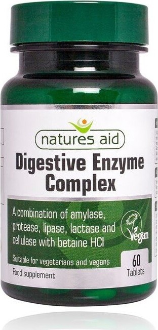 Natures Aid Trávicí komplex s betainem je doplněk stravy ve formě tablet, který obsahuje betain hydrochlorid (betain HCl), amylázu, proteázu, lipázu, laktázu a celulázu. Trávicí enzymy jsou obvykle produkovány v zažívacím systému a jsou zodpovědné za rozklad potravin. Bez obsahu sladidel, konzervačních látek, lepku a droždí. Balení obsahuje 60 tablet.