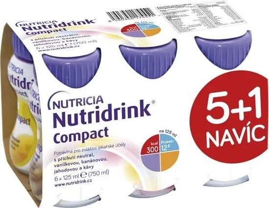 Nutridrink Compact 5+1 je vysokoenergetická nutričně kompletní tekutá výživa. Potravina pro zvláštní lékařské účely. Nutridrink je určený pro řízenou dietní výživu při podvýživě související s nemocí. Balení obsahuje tyto příchutě: Neutral, banán, káva, vanilka. Pouze pro použití pod lékařským dohledem.Pouze pro enterální použití. Vhodné jako jediný zdroj výživy.Balení obsahuje 6x125 ml.