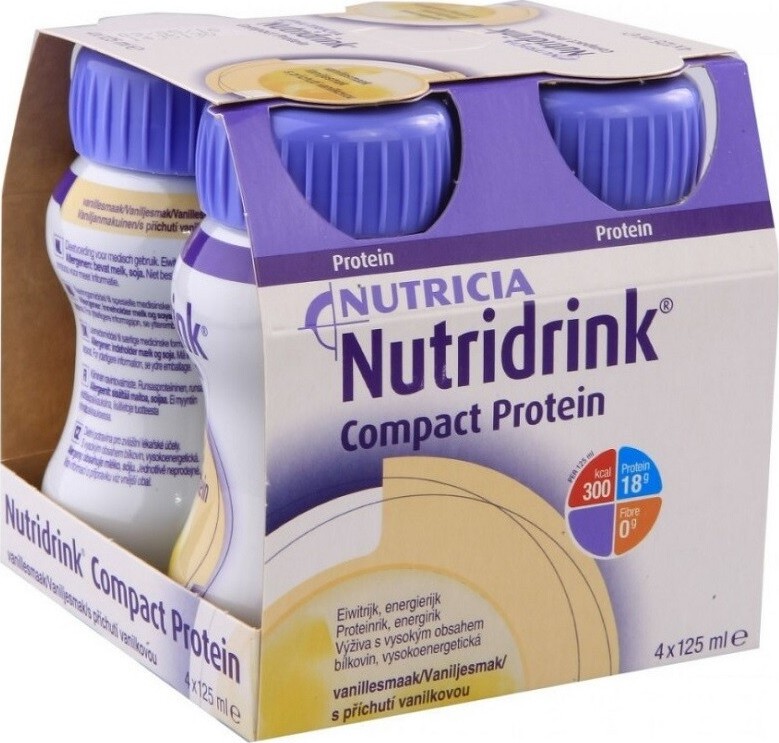 Nutridrink Compact Protein s vanilkovou příchutí je potravina pro zvláštní lékařské účely, která je určená pro řízenou dietní výživu při podvýživě související s nemocí. Vysokoenergetická tekutá výživa s vysokým obsahem bílkovin a bez lepku.Balení obsahuje 4x125 ml.