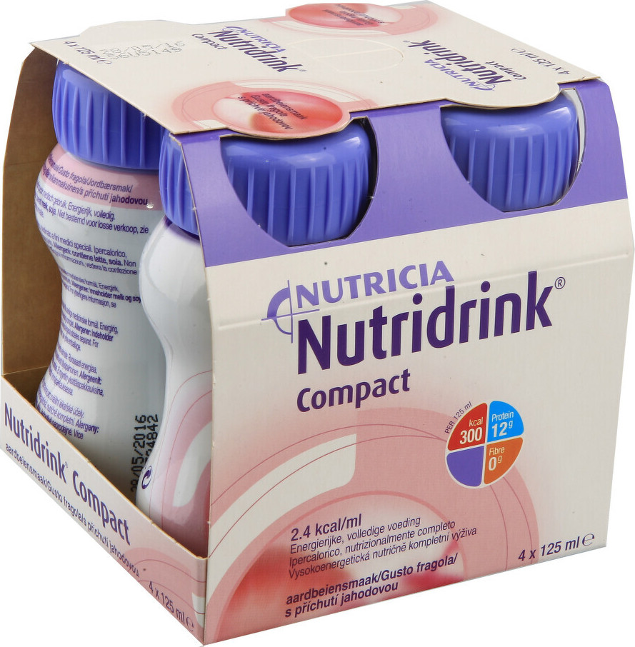 Nutridrink Compact s jahodovou příchutí je vysokoenergetická nutričně kompletní tekutá výživa. Potravina pro zvláštní lékařské účely. Pro řízenou dietní výživu při podvýživě související s nemocí. Bez lepku.Pouze pro použití pod lékařským dohledem.Vhodné jako jediný zdroj výživy.Balení obsahuje 4 x 125 ml.