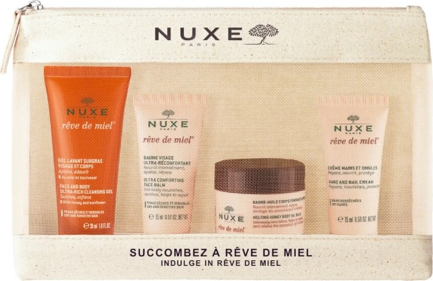 NUXE Cestovní taška s miniaturami Reve de Miel.Rêve de Miel Ultra Sprchový gel na obličej a tělo 30 mlRêve de Miel Ultra Zklidňující balzám na suchou a citlivou pleť 15 mlRêve de Miel Melting Honey Medový olejový balzám 30 mlRêve de Miel krém na ruce a nehty 15 mlSprchový gel na obličej a tělo: Zklidňuje a zjemňuje. Na suchou a citlivou pokožku. Tento zvláčňující sprchový gel bez mýdla jemně čistí obličej a tělo. Díky obsahu (med, slunečnice, čistící báze rostlinného původu) nevysušuje pokožku a zklidňuje. Mycí báze rostlinného původu nenarušuje hydrolipidický film pokožky. 90% ingrediencí je rostlinného původu. Bez parabenů.Ultra zklidňující balzám na obličej Rêve de Miel na suchou a citlivou pleť:  Luxusní složení obsahuje med, propolis a vzácné oleje, které pomáhají obnovit lipidy, intenzivně pleť vyživují a poskytují ji ochranu před vnějšími vlivy jako je vítr a chlad. Navrací pleti pružnost a okamžitý komfort. Ulevuje od pocitů podrážděné a stažené pleti a potlačuje začervenání a hrubou pleť. 92,9% přírodních složek.Medový olejový balzám na tělo: Intenzivně vyživuje pokožku, pomáhá jí regenerovat a ulevuje od pocitů podráždění. Na velmi suchou a citlivou pokožku. Obsahuje med a vzácné oleje. Obsahuje 93% přírodních složek.Krém na ruce a nehty: Reparuje, vyživuje, chrání. S medem, slunečnicí, vzácnými oleji a vitamínem E. Suché a poničené ruce. 89% ingrediencí je rostlinného původu. Bez parabenů. Chrání pokožku rukou před projevy stárnutí kůže. Jemná tající textura nezanechává mastný a lepivý film.