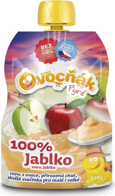 Ovocňák pyré 100% Jablko je ovocné pyré, vyrobeno pasírováním za studena, bez přidané vody, bez přidaného cukru, bez aromat, konzervantů, škrobů. S certifikací jako dětský příkrm od ukončeného 5. měsíce. Pouze pasterované. Balení obsahuje 120 g.
