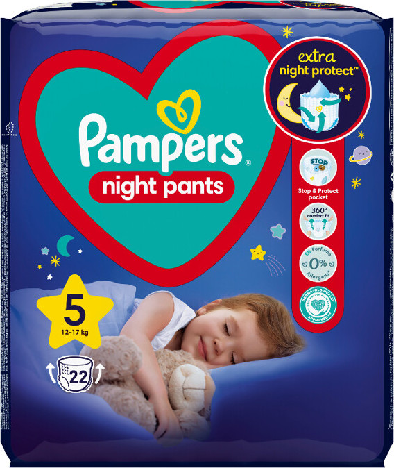Plenkové Kalhotky Pampers Night Pants ve velikosti 5 jsou určené pro děti vážící 12-17 kg. Poskytují lepší ochranu pro klidný spánek díky zesílenému jádru. Plenkové kalhotky Pampers Night Pants nabízejí extra ochranu po celou noc. Přizpůsobí se tvaru těla vašeho děťátka a pomáhají tak předcházet protečení. Mají zesílené jádro, a tak poskytují extra ochranu pro až 12 hodin v suchu. Pevnější manžetky kolem nožiček pomáhají předcházet protečení kolem nožiček. Neobsahují parfémy ani žádnou z 26 látek klasifikovaných EU jako alergeny. Snadno se oblékají jedním tahem, snadno se svlékají roztrhnutím na bocích a snadno je zklikvidujete - jednoduše se srolují a zajistí páskouBalení obsahuje 22 kusů plen.
