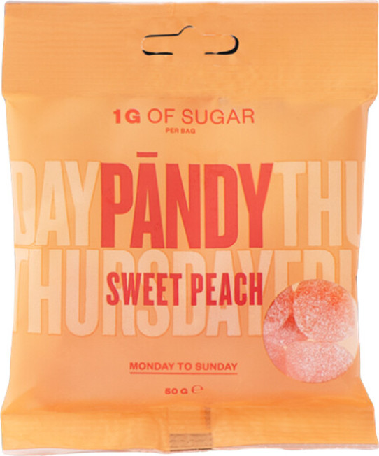 PANDY Candy Sweet Peach jsou sladkokyselé gumové bonbony bez přidaného cukru s příchutí broskve. V celém balení je pouze 1 g cukru. Doslazované jsou sladidly. Tyto bonbony jsou téměř bez tuku a mají vysoký obsah vlákniny (až 54 %). Poslouží jako alternativa běžných kalorických bonbónů. Ideální jsou jako malý dárek pro potěšení fitness nadšenců a těch, kteří si hlídají kalorický příjem a štíhlou linii. Skvěle se hodí jako malá svačinka na výlety nebo zdravější náhrada klasických bonbónů.Obsahují velmi málo cukru (1 g v celém balení).Neobsahují téměř žádný tuk.Mají vysoký obsah vlákniny.Obsah balení je 50 g.