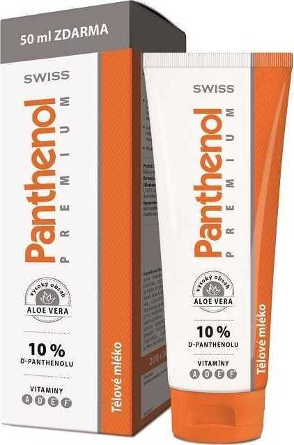 Panthenol 10% Swiss PREMIUM tělové mléko přináší okamžitou úlevu pro sluncem podrážděnou pokožku a napomáhá její regeneraci. S extra vysokým obsahem D-Panthenolu 10%, aloe vera, měsíčku lékařského a vitamínů A, D, E a F. Přípravek pokožce dodává svěžest a energii.Suchou a podrážděnou pokožku regeneruje a vyživuje po pobytu na sluníčku, v soláriu či chlorované vodě. Příjemně chladí a rychle se vstřebává. Je vhodný pro všechny typy pokožky, zejména pro velmi citlivou pokožku, a pro děti. Balení obsahuje 200 ml 50 ml.