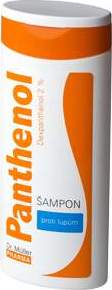 Panthenol šampon proti lupům se používá při zvýšené tvorbě lupů a při zvýšeném maštění vlasů. Lze jej použít také při problémech s vypadáváním či třepením vlasů. Šampon vlasy a vlasovou pokožku vyživuje a chrání je před nepříznivými vnějšími vlivy a před mechanickým poškozením. Díky obsažené složce D-panthenolu působí šampon hloubkově až ke kořínkům vlasů po celé jejich délce. Panthenol šampon dodává vlasům lesk a zlepšuje jejich ohebnost. Panthenol je důležitý také pro udržení zdravé pokožky a nehtů. V případě nedostatku kyseliny pantothenové kůže rychleji stárne a je méně pružnější, vlasy ztrácejí lesk a častěji se lámou. Balení obsahuje 250 ml.