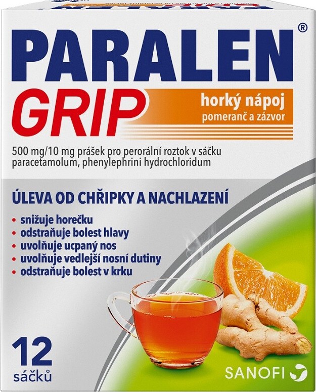 Přípravek PARALEN GRIP horký nápoj pomeranč a zázvor obsahuje kombinaci dvou léčivých látek ? paracetamolu a fenylefrinu. Zatímco paracetamol působí proti bolesti a horečce, fenylefrin uvolňuje dýchací cesty.Přípravek PARALEN GRIP horký nápoj pomeranč a zázvor je určen k odstranění příznaků chřipky a nachlazení, včetně horečky, bolesti hlavy, bolesti v krku a bolesti svalů a kloubů. Navíc pomáhá při rýmě, uvolňuje ucpaný nos a vedlejší nosní dutiny, a tím usnadňuje dýchání.Přípravek užívejte pouze tehdy, když příznaky chřipky nebo nachlazení doprovází ucpaný nos nebo zánět vedlejších nosních dutin. Netrpíte-li ucpaným nosem ani zánětem vedlejších nosních dutin, měli byste užívat jednosložkový přípravek obsahující pouze paracetamol.Přípravek je určen pro dospělé a dospívající od 12 let s tělesnou hmotností větší než 33 kg.Balení obsahuje 12 sáčků.