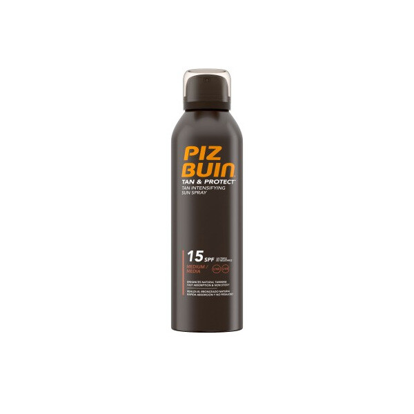 PIZ BUIN Tan and Protect spray s ochranným faktorem SPF15 urychluje přirozený proces opalování a poskytuje pokožce hydrataci, výživu a vitamin E. Obsahuje technologii HELIOPLEX, která chrání pokožku pře UVA a UVB zářením. Dále IllumitoneTM zvyšující přirozenoou produkci melatoninu. Nezanechává stopy na oblečení.