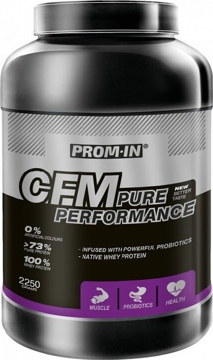 Prom-In CFM Pure Performance je doplněk stravy ve formě prášku pro přípravu proteinového nápoje s kokosovou příchutí. Při jeho výrobě se používá metoda CFM (cross flow microfiltration – mikrofiltrace zkříženým tokem přes keramické filtry), která zachovává maximum bio-aktivních frakcí původní suroviny.Hlavní výhody100% nativní protein.Obsahuje laktázu, proteolytické enzymy a probiotika.Neobsahuje umělá barviva, plnidla ani zahušťovadla.Balení obsahuje 2250 g (56 dávek) proteinového prášku.
