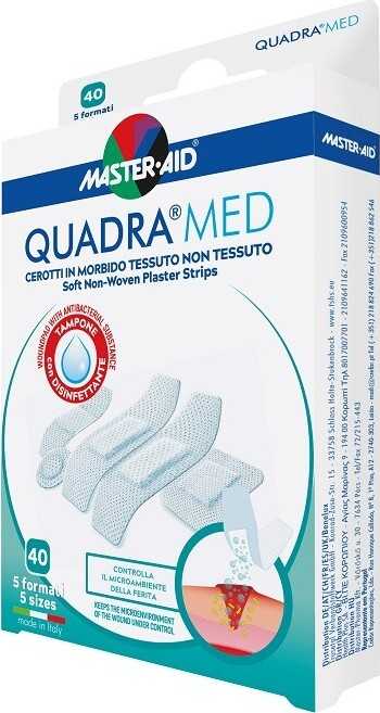 Quadra Med jemné náplasti z netkané textilie s antiseptickým polštářkem s chlorhexidin diglukanátem 0,5 % proti virům, bakteriím a houbám. Prodyšné, dobře drží. Vysoký komfort. Sensitive hypoalergenní lepidlo bez latexu. Bezbolestně se sundavají. Vhodné pro velmi citlivou pokožku. Balení obsahuje 40 ks.
