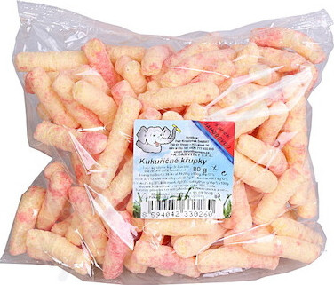Křupky jsou vyrobeny extruzí bez použití tuku, obalovány v upraveném cukru (mírně karamelizovaný). Neobsahuje lepek. Jahodová příchuť.Balení obsahuje 80 g.