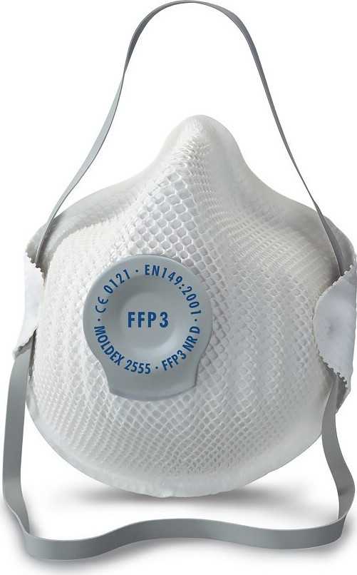 Respirátor MOLDEX 2555 proti pevným částicím řady FFP3 NR D na ochranu dýchacích cest. Proti zdraví škodlivým karcinogenním prachům, mlhám, dýmu na vodném nebo olejovém základě. Příkladem použití jsou práce s toxickými kovy, tvrdým dřevem, radioaktivními a biologicky aktivními látkami. DuraMesh: Pevná a odolná konstrukce, drží svůj tvar. ActivForm: Není třeba nosní svorky. Smyčkový upínací pásek pro rychlé, jednoduché a bezpečné nasazení a sejmutí. Testováno a certifikováno podle EN 149:2001 plus A1:2009 (dle nařízení Evropského parlamentu a Rady 2016/425). Jeho životnost je závislá na koncentraci částic v atmosféře uživatele a jeho dechové frekvenci. Respirátory nechrání proti plynům, toxickým, radioaktivním a mikrobiálním částicím a škodlivým parám. Nepoužívejte je v místech, kde je méně než 19,5% koncentrace kyslíku či v prostředích s jedovatými plyny. Parametry: max. celkový vnitřní únik 2% max. Průnik filtru 1 % max. dýchací odpor podle EN 149 3,0 mbar Balení obsahuje 4 ks. Dovozce: Moldex/Metric v.o.s., Janderova 525, 56203 Ustí nad Orlicí, Česká Republika Výrobce: Moldex-Metric AG & CO.KG, Tuebinger Straße 50, 72141 Walddorfhaeslach, Německo Odkazy k nahlédnutí: Prohlášení o shoděEvropská norma EN 149:2001 A1:2009 Datum expirace 12/23.